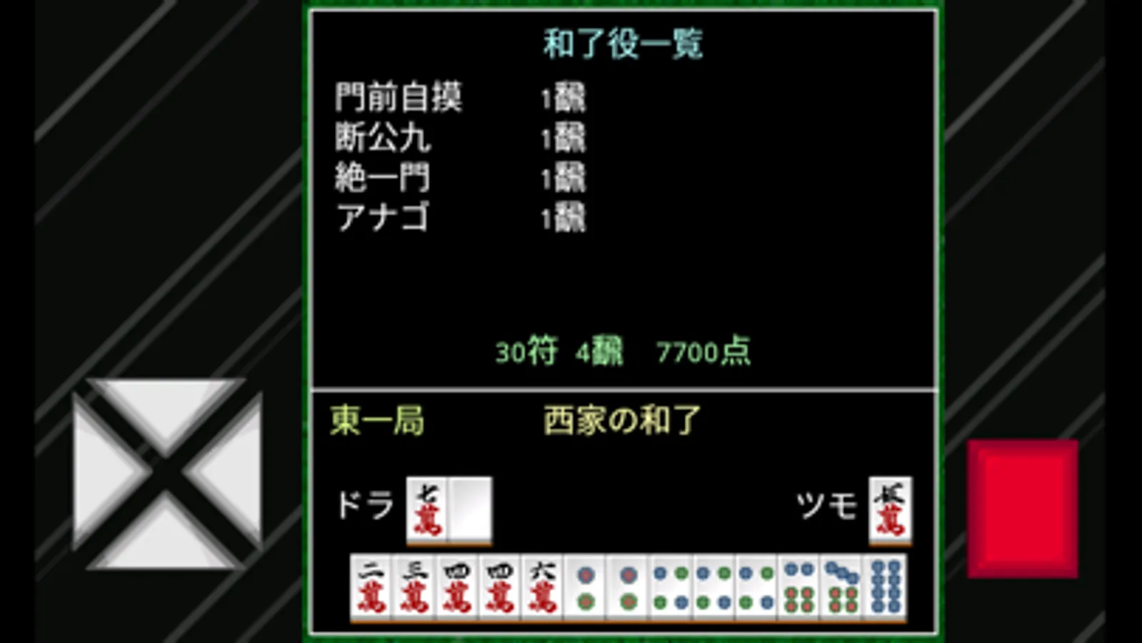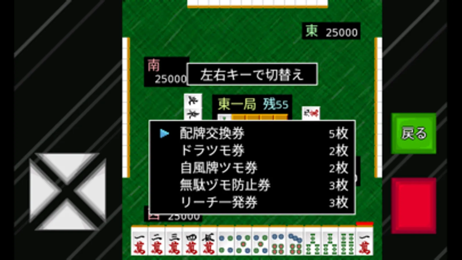 牌交換やアイテム使用(積込み、一発自摸などが可能)が可能な勝ちやすい4人打ち麻雀です。牌交換のみ可能なモードとアイテムが使えるモードがあります。