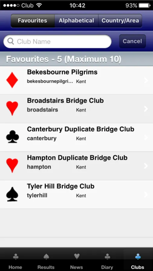 The Results View shows details similar to the club web site including Personalised Score Cards, Boards and Hands where available. Due to the size of screen some information is omitted.