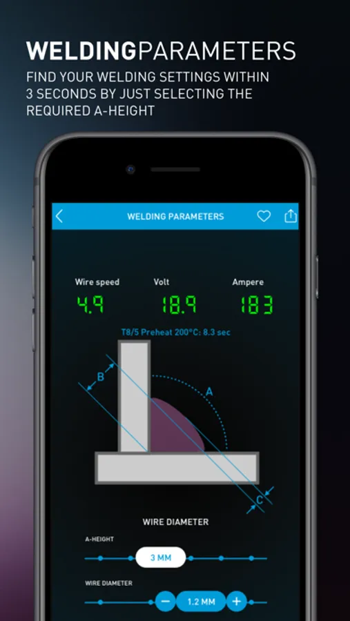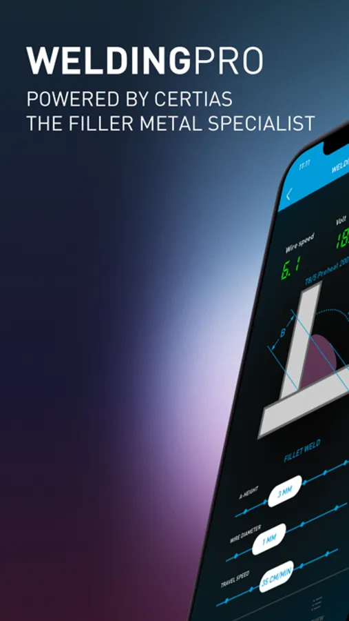 Fill in the A height of your filled weld and this app will provide you with the optimum settings for wire speed, volt and travel speed. This parameter app is able to give you the optimum settings for steel, aluminum, stainless steel, for both solid and fluxcored wires and. Just slide the slider until the parameters get green to tell you that they are the optimum settings.