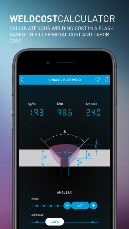 calculating the total welding cost in just a few clicks including labor, filler metal and gas cost. Sliders are built in the app to determine the most cost-effective parameters for your welding job by changing the angle of the joint or by changing the current.