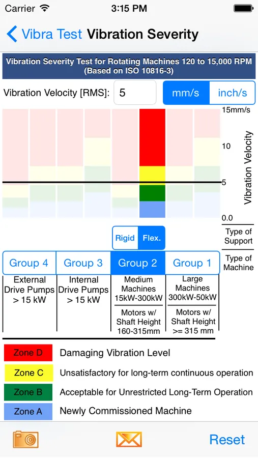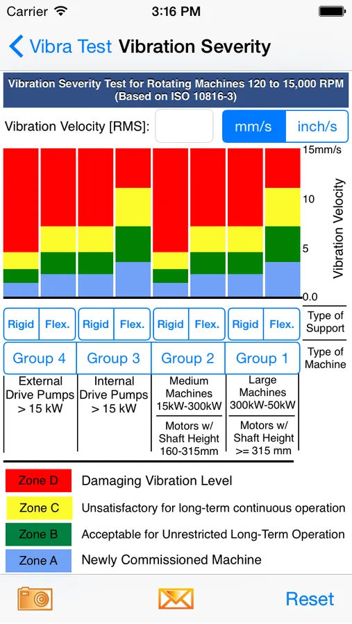 Vibra Test is a tool for vibration severity test of rotating machinery based on ISO 10816-03. User selects the type of the machine based on the power rating of the machine, selects the type of foundation (flexible or rigid), enters the RMS value of vibration velocity, and the App shows the operating condition of the machine. (Zone A: Blue, Zone B: Green, Zone C: Yellow, Zone D: Red).