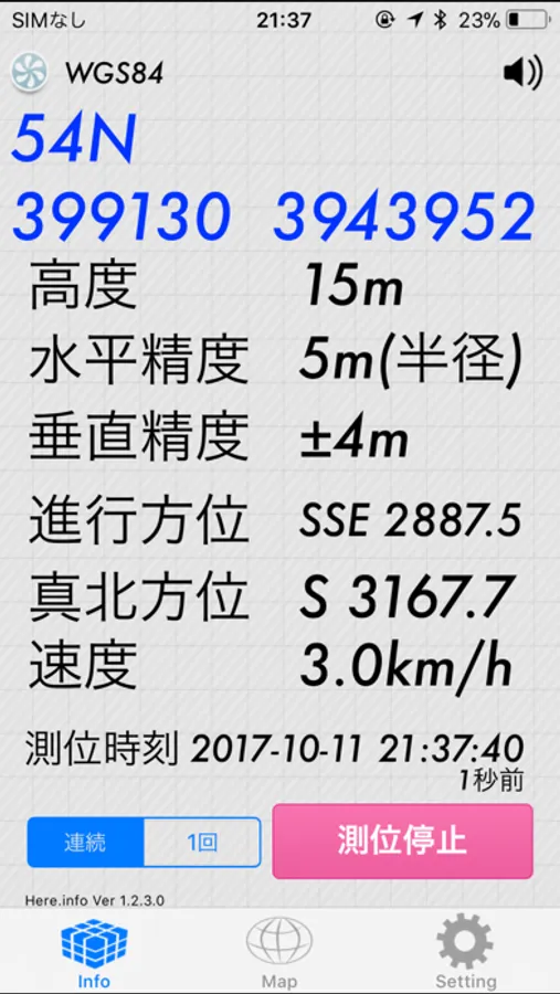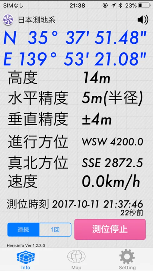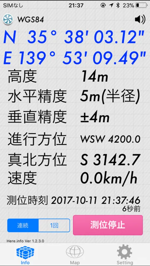 iPhoneのGPSはWGS84という世界標準の経緯度で動いています。その座標を日本測地系に変換して表示するのですが、簡易的な変換式を使用しているため国土地理院の変換サイトで変換した座標と比べて5mほどの誤差が出ます。1m単位の精度が求められる用途には使わないでください。
