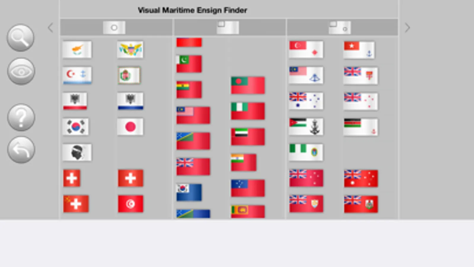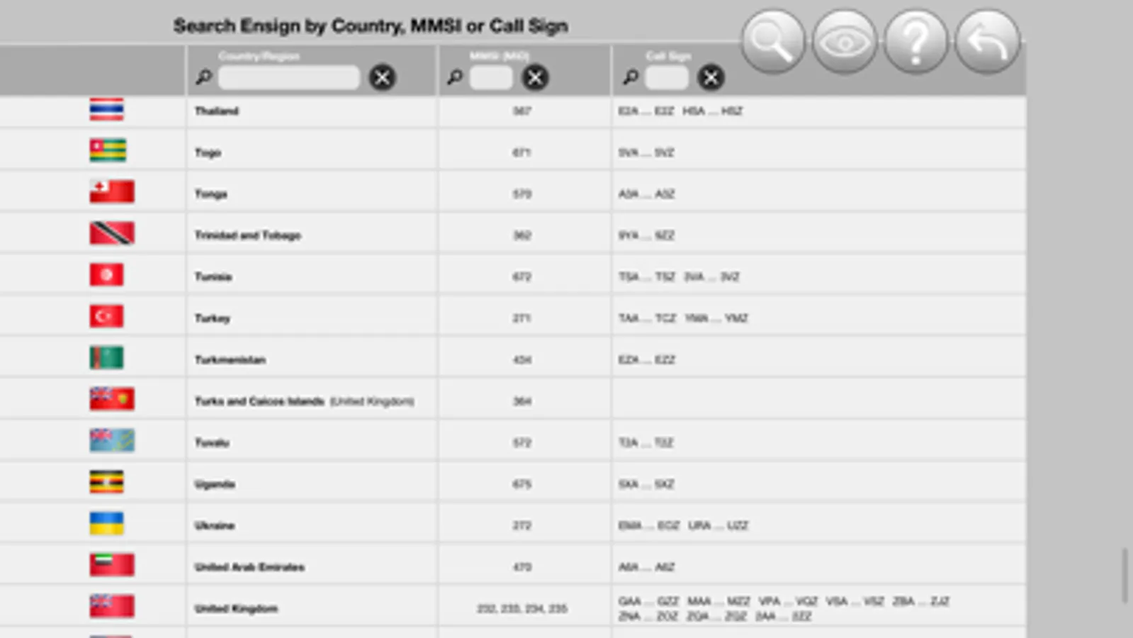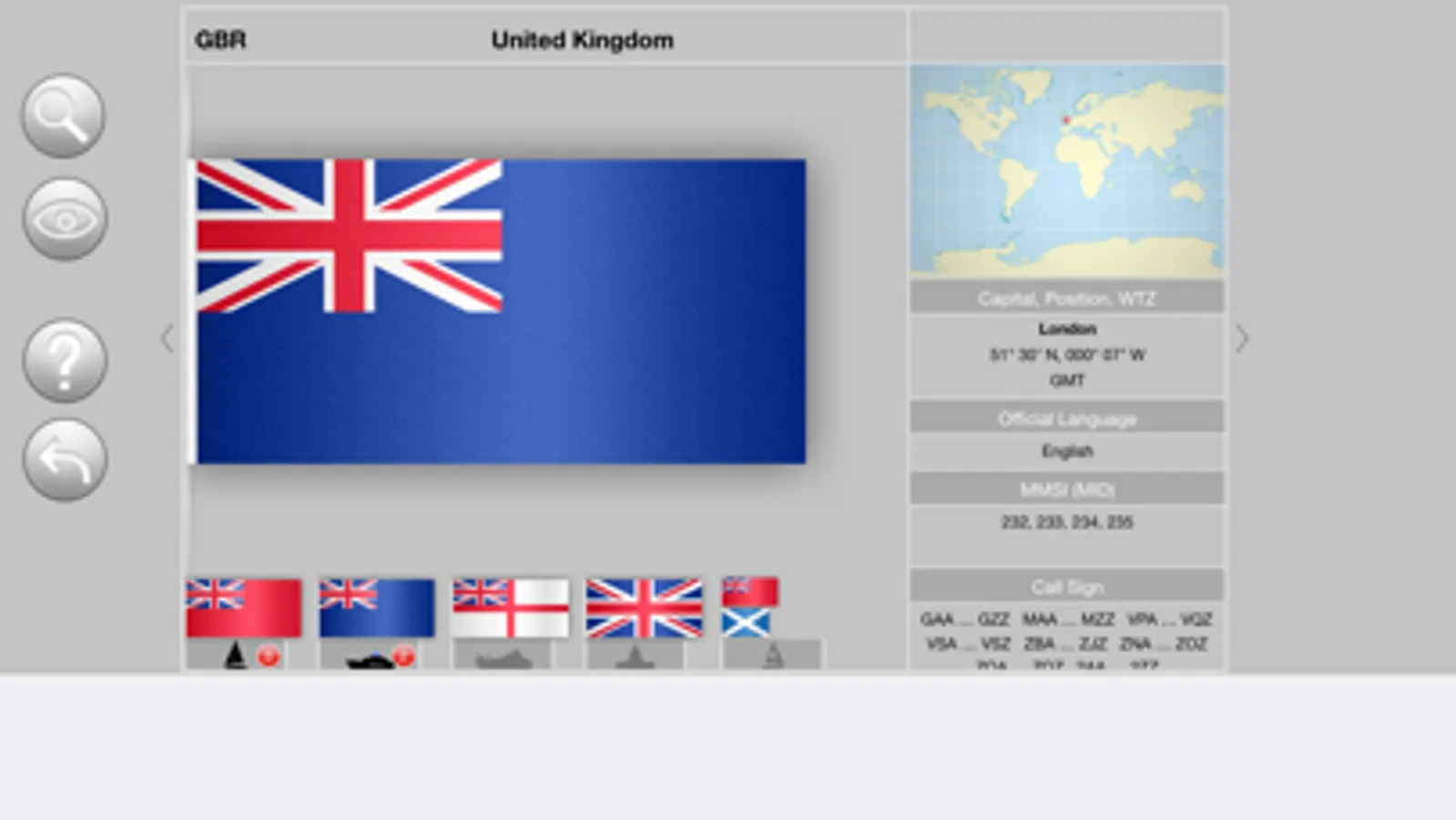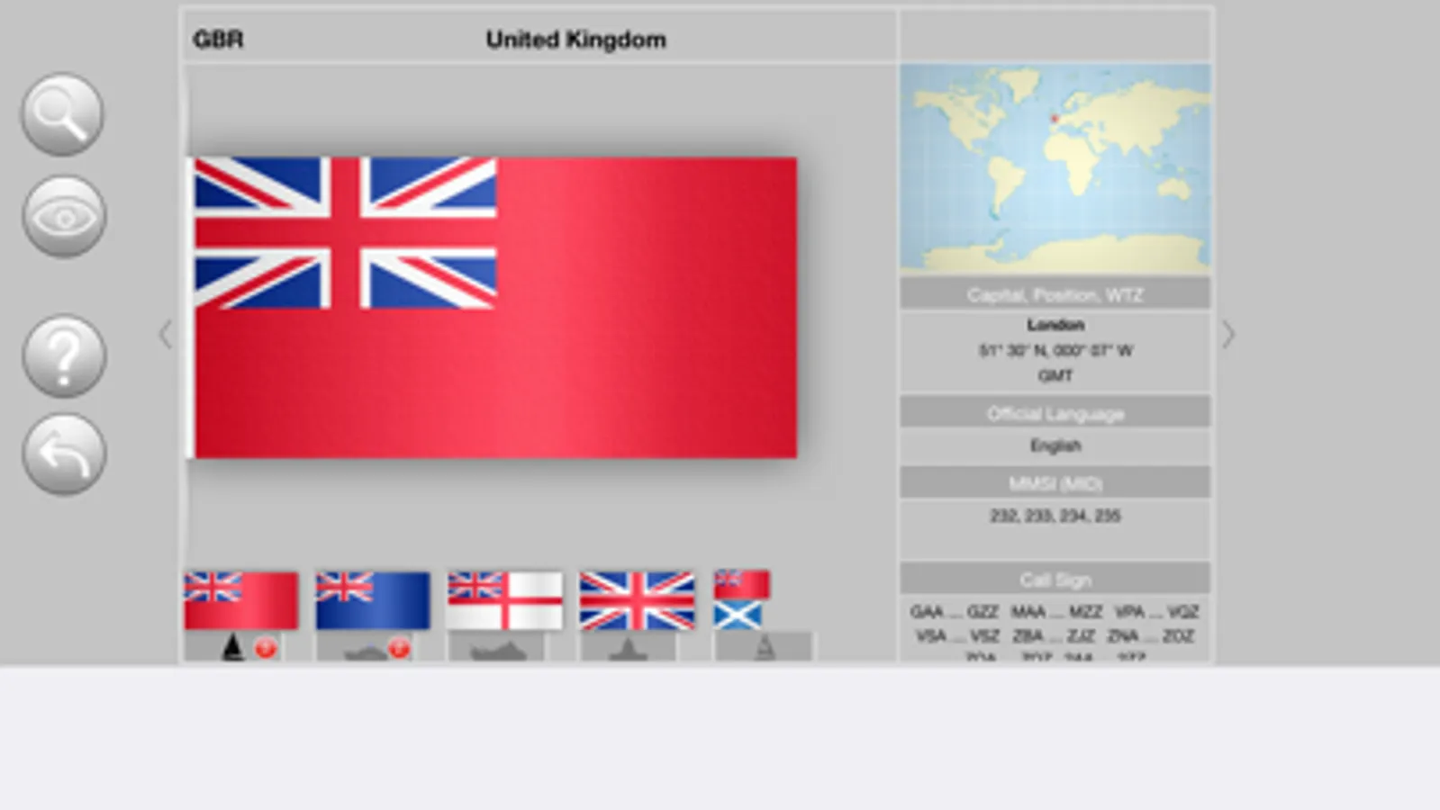 No matter whether you will encounter a ship whose ensign you don't know or whether you see the MMSI or the call sign of a ship with the AIS function of a ship's chart plotter. World Ensigns can quickly show you the ship's country of origin as well as further information about the countries geographic location, timezones and official languages. In addition to the different flags used in this country you will get information about the geographic location of the country, it's timezones and the official languages.