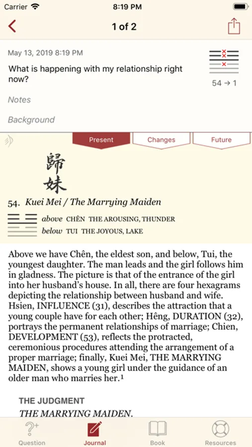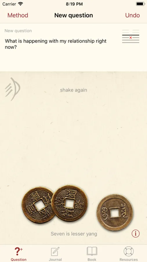 Ancient oracle meets modern classic! Explore an interactive English version of "The I Ching or Book of Changes" by Richard Wilhelm, edited by Hellmut Wilhelm, and translated by Cary F. Baynes, using a coin oracle or yarrow stalks, and an integrated journal.