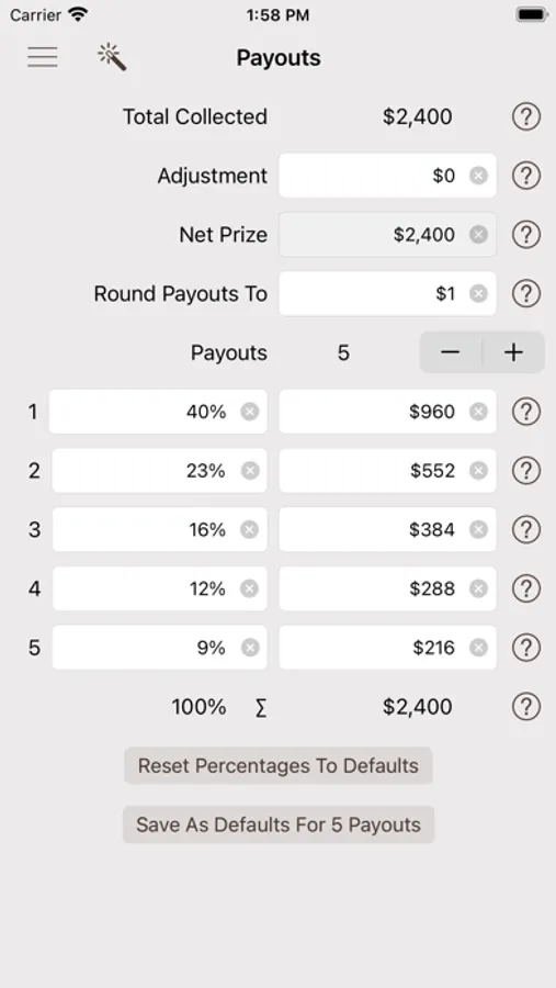 • Payout Calculator: Set the number of payouts, and adjust the percentages that go to each payout. The net prize amount is automatically calculated from buy-ins, add-ons, and re-buys, and can be adjusted to include an amount or percentage that goes to the house.