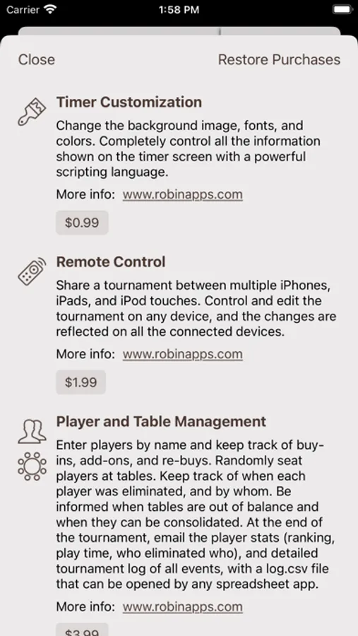 • Player and Table Management: Enter players by name and keep track of buy-ins, add-ons, and re-buys. Randomly seat players at tables. Keep track of when each player was eliminated, and by whom. Be informed when tables are out of balance and when they can be consolidated.