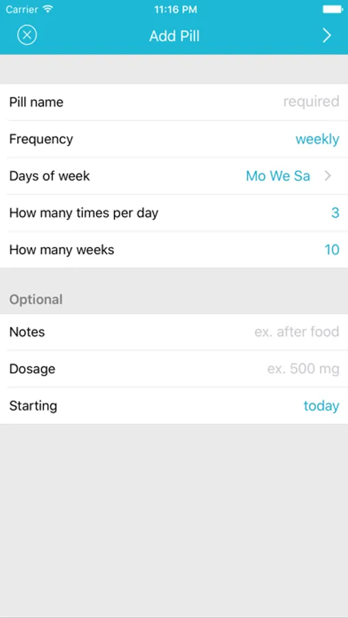 - fixed time schedule - choose times of day when you take your pills (up to the minute) and specify the days (daily, every 1-10 days, weekly - specify days of week, every two weeks, every 30 days, every 90 days)
