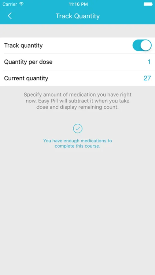 Specify amount of medication you take per dose, Easy Pill will compute the total you need to complete your course and additionally warn you when medication is running low and even tell how much more you need.