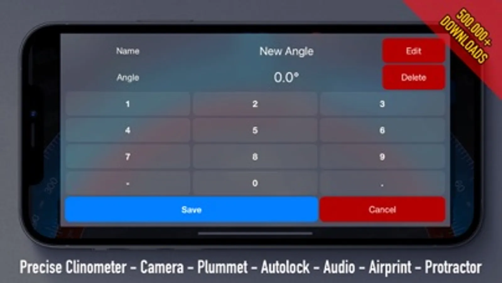 Use the clinometer the measure angles along all edges of your phone. You can set a target angle by moving your finger across the display. Additionally you can store up to 5 angles in the angle list and recall them quickly as target angles.