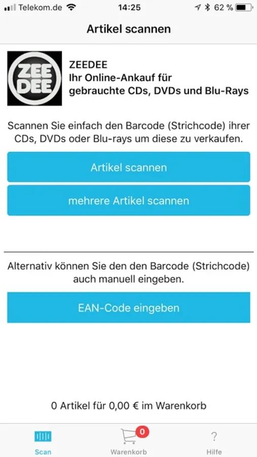 Benutzen Sie Ihr iPhone als Barcodescanner um Ihre gebrauchten CDs, DVDs und Blu-Rays bequem und schnell an zeedee.de zu verkaufen. Scannen Sie einfach den Barcode des Artikels. Sie erhalten sofort einen garantierten Preis, sofern die Ankaufsbedingungen erfüllt sind. Schicken Sie uns ein Paket mit den angebotenen Artikeln. Wir übernehmen die Portokosten. Oder bringen Sie die Ware persönlich in unserem Berliner Ladengeschäft vorbei.