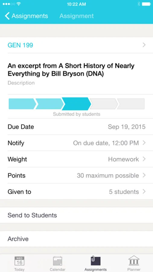 When creating assignments for your students, you can mark them depending on their status (learn more from the app) and then send the assignment to the students enrolled to your course.