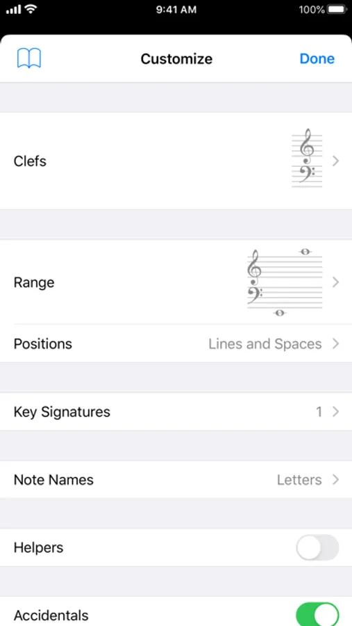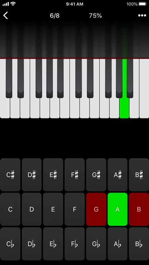 Tap the piano key corresponding to the written note on the staff. While similar to Note Identification, this exercise uses a piano keyboard rather than note name buttons.