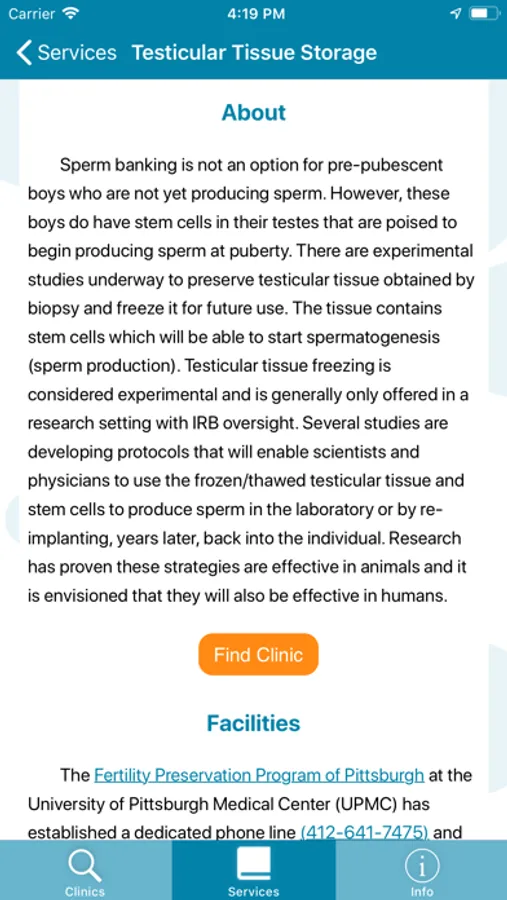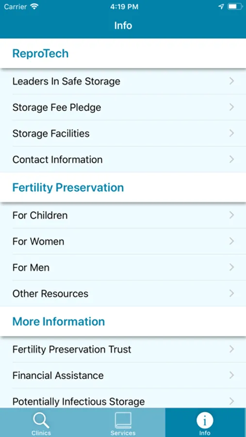 ReproTech's Fertility Preservation App provides oncology professionals with resources to connect valuable and up-to-date information on clinics and services to newly diagnosed patients. Features of the App include: