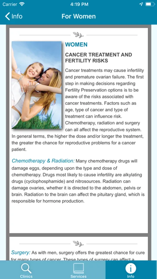- Information on Fertility Preservation and its options for men, women, and children