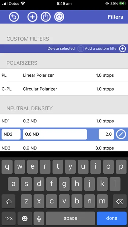 The app supports a wide range of film stocks and allows the user to add various common exposure filters such as NDs and Polarizers.