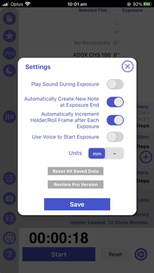 The app includes in-app purchase to unlock pro features including a note-keeping feature, the ability to add custom films and the ability to select often used film stock as favorites.
