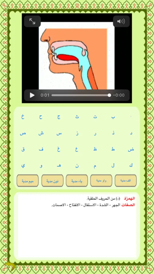- رسوم توضيحية محركة مرفقة بالصوت لمخارج الحروف وأحكام التجويد