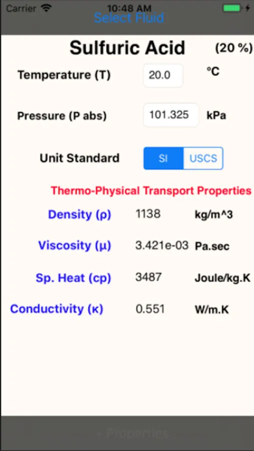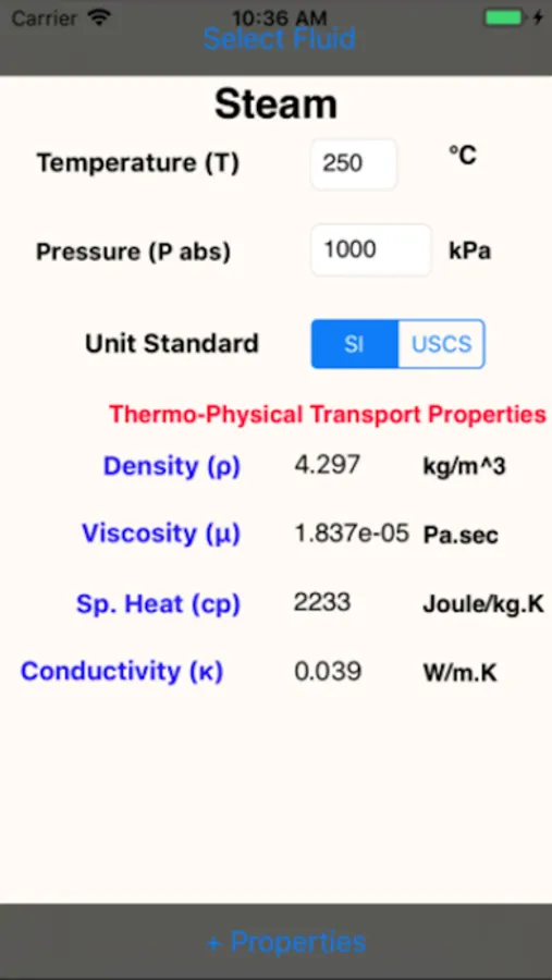 The property data is presented in SI and USCS units for the given pressure and temperature conditions. Property data is displayed in two parts. The first part is on transport properties that are common to all fluids and presented in home screen as shown in the screen shot. The second part is displayed as plus properties that are exclusively for gases and steam as given below.