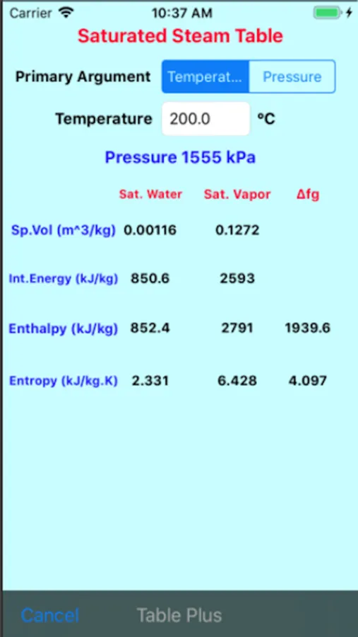 For steam, additional thermodynamic property data are provided in the form of a Steam Table covering all 3 states such as saturated water, saturated vapor and superheat conditions at a given pressure and temperature. Besides, a separate section is provided for saturation properties where users can choose either temperature or pressure as primary argument as shown in the screen shot.
