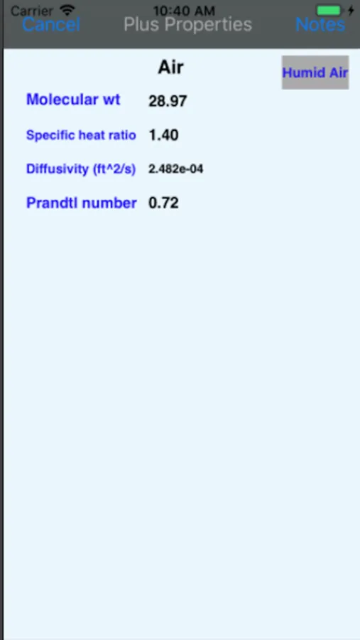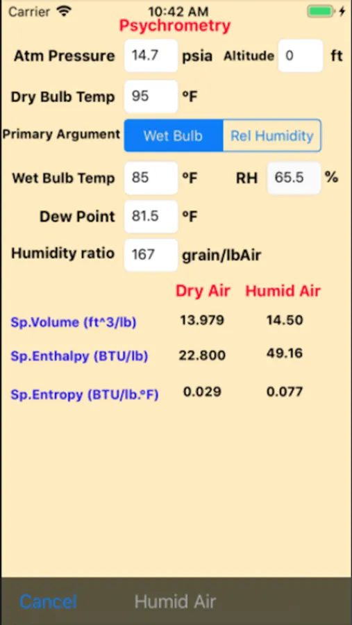 Similarly for Air, there is a section on humid air properties that are consistent with psychrometric chart. Users can choose either wet-bulb temperature or relative humidity as primary argument in addition to dry bulb temperature. The result includes humidity ratio, dew point temperature, specific volume, specific enthalpy and entropy for both dry and humid air as shown in the screen shot. In addition app notes has a link to a complete documentation on implementation and validation of math-models with industry examples.