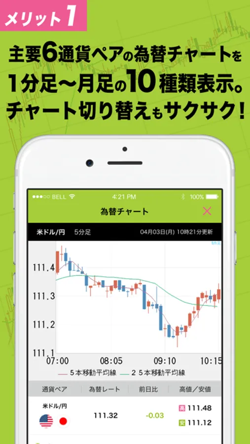 そして、各通貨ペアをタップすると、すぐに為替チャート画面に移行できます。