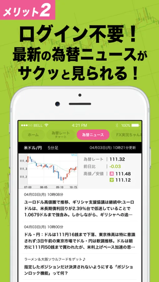 ミニ為替チャートと為替レートも表示されており、相場の動きを確認しながら、ニュースを読むことが可能です。