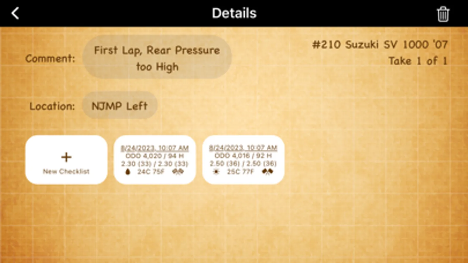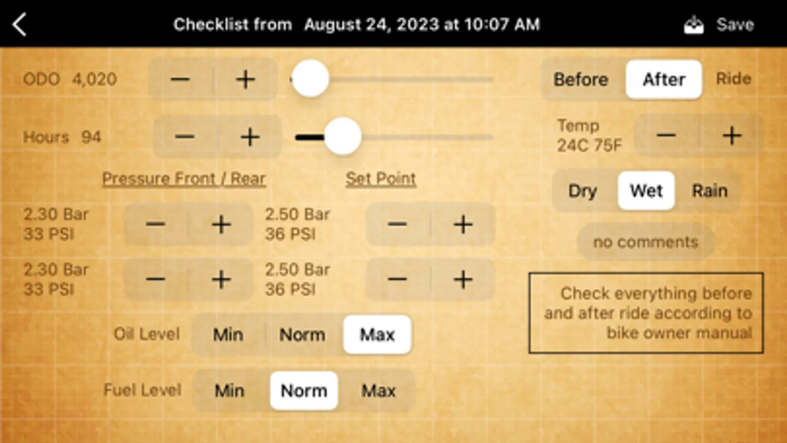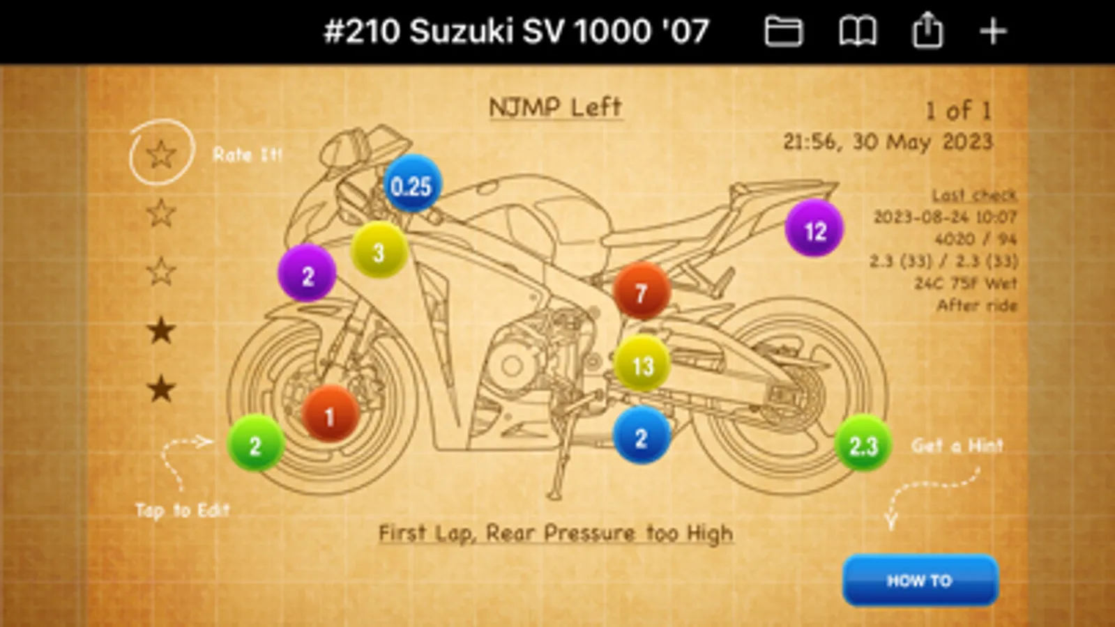 Allows you to track and log suspension settings changes on your motorcycles during track day or regular street riding.