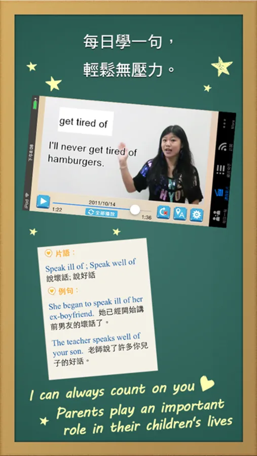 學英文變輕鬆了,每天一句輕鬆學!「每日一句學英文」首創真人影音教學,課程內容廣泛,結合生活、時事、知識,並包含片語、完整例句,讓您在沒有壓力下,一天天累積您的英文功力。