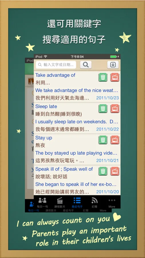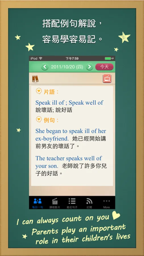 提供每日的片語及例句內容,並提供真人影音。您也可以按在想知道解釋的英文 (中文) 單字上,程式會自動切換到「字典」畫面顯示該單字的中文 (英文) 解釋及詳細說明。