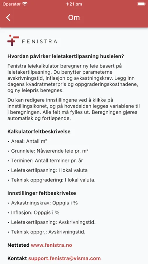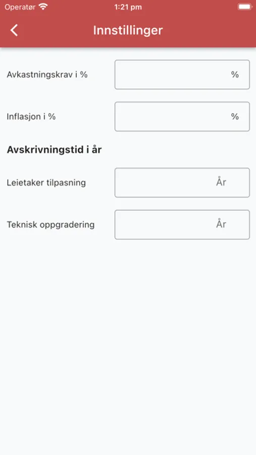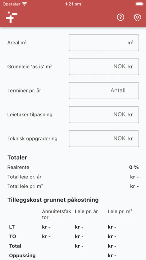 Arbeider du med utleie av lokaler, og opplever at leietaker ønsker tilpasning av lokalene, vil denne kalkulatoren være til hjelp for å beregne ny leie. Tast inn markedsleie og estimat over samlede kostnader for tilpasningene. Applikasjonen beregner ny leie basert på angitt inflasjon, avkastningskrav og avskrivningstid.