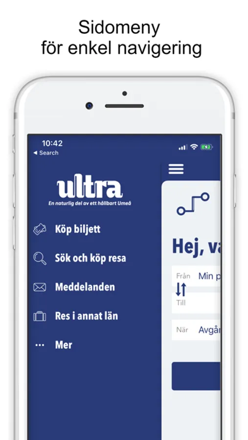 Med Ultras app kan du också få reseinformation när du befinner dig utanför Umeå. Använd funktionen ”Res i annat län”, så kan du söka och köpa resa i 83 procent av Sverige.