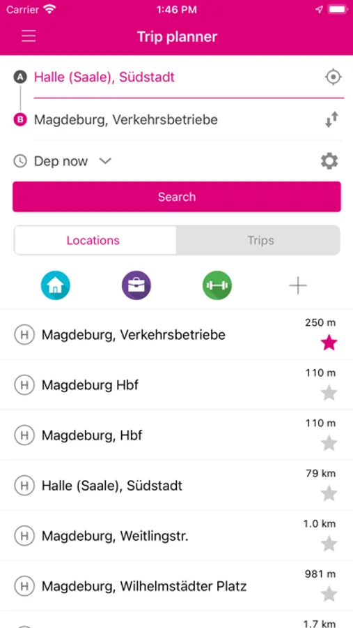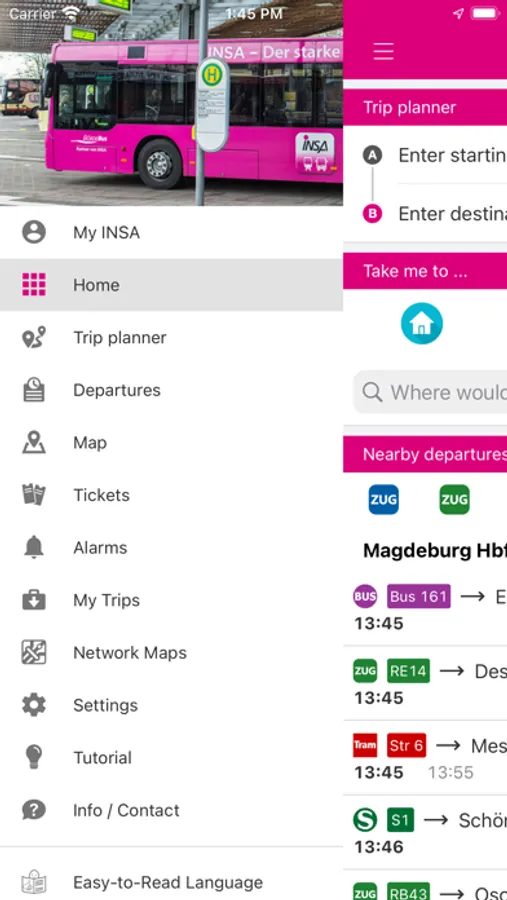 Easy journey planning from your current location to a train station, a stop or an address. INSA knows every timetable of the public transport companies in Saxony-Anhalt, in the MDV as well as the nationwide railway traffic. INSA automatically finds the most suitable stops in the surrounding area.