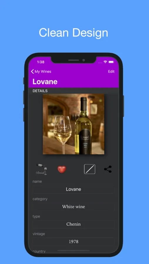 • Storage of photos, properties (12), ratings (5) and notes for each wine