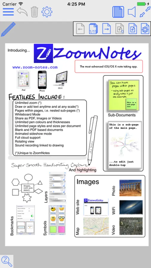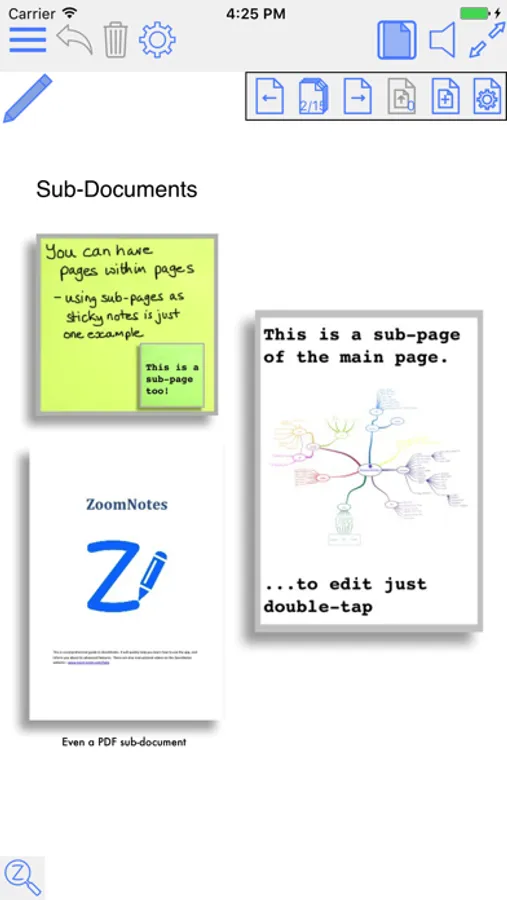 This unique feature allows you to use ‘pages within pages’. This allows you to use sticky-notes and enables the creation of hierarchical visual files. You can also insert whole pdf files as sub-pages, or import pages from other ZoomNotes documents into a sub-page.