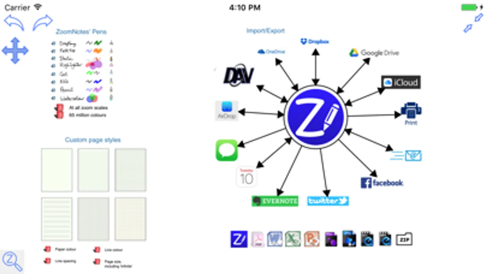 Share documents as PDF files, images, videos or ZoomNotes documents (via email, iTunes, clipboard, Dropbox, Twitter and Evernote, Airdrop, iCloud Drive and Open in.
