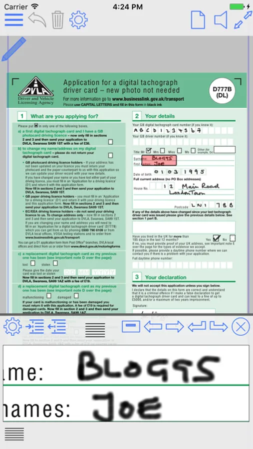 Enter typed text via keyboard; with a wide range of fonts and font sizes, font colours, fills and borders. Text can be entered at all zoom scales and can be selected and moved, scaled and rotated.