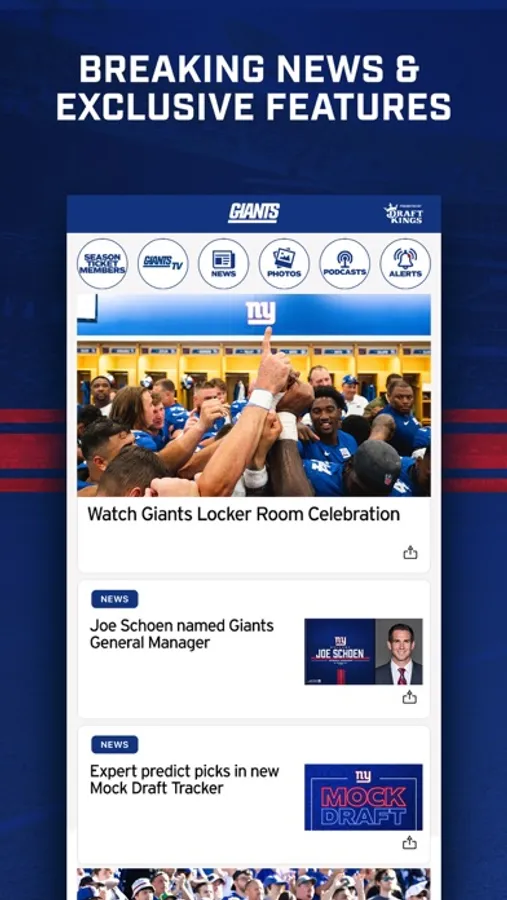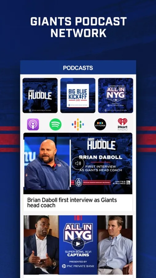 The New York Giants official mobile app is your destination for all things New York Giants. The updated mobile app includes the best Giants highlights, news, videos, photos, and podcasts. Here are some of the top features in the Giants mobile app: