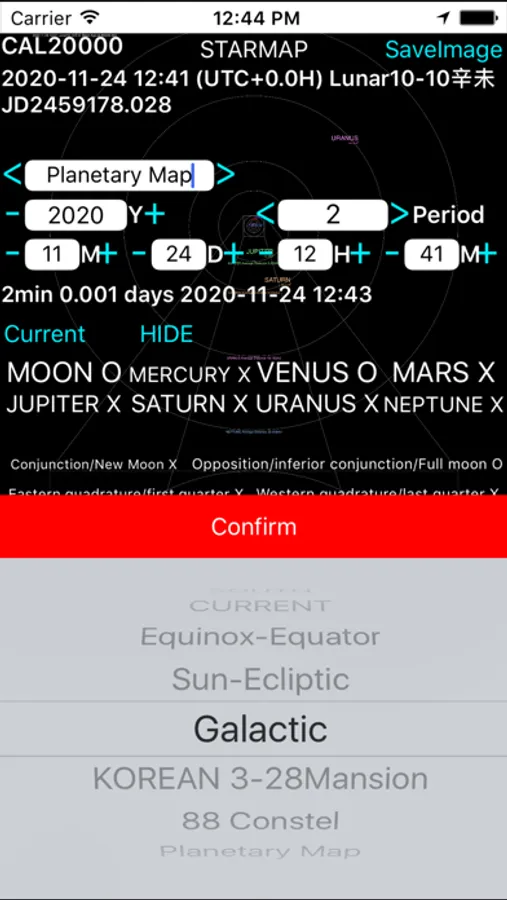 Sun/Moon/Planets events are calculated realtime and shown its time and position such as Conjunction/New Moon, Opposition/Full moon, quadrature/quarter, great elongation, statrionary(reverse start/finish), ascending,descending node, perigee/perhelion, apogee/aphelion, planet conjunction and 24 solar term.