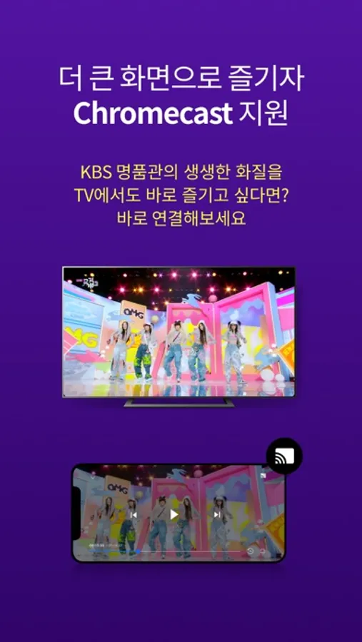 - 크롬캐스트 지원: KBS 명품관의 생생한 화질을 TV에서도 즐겨보세요.