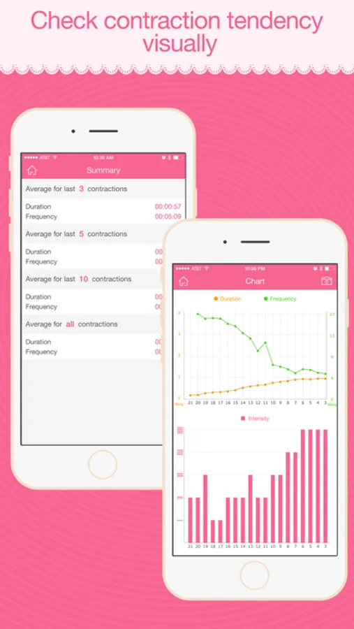 Regular contraction is an importance sign of labor, when that big time is approaching, duration of contraction becomes longer and stronger, frequency becomes shorter. And contractions will show their laws when true labor is coming, so keep tracking contractions will help you distinguish true labor from ‘false’ labor. Graph of contraction duration and frequency makes it easy for you to see the tendency of contractions.