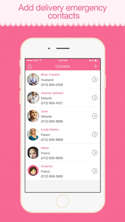 ⁃ Contact module for you to add your labor contacts, you can call them conveniently by one touch if your baby is coming when you are logging contractions.