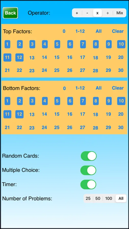 Math Cards ! ! is a great way to learn and practice addition, subtraction, multiplication, and division. Customize your own problem sets to focus on your needs. Set the top numbers and bottom numbers for each operator.