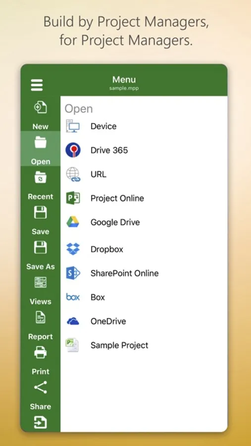 Housatonic’s Project Viewer 365 for iOS allows you to open MS Project Plans from cloud locations like Google Drive. Dropbox, OneDrive, SharePoint Online, Box, Basecamp, URL Links and email attachments.