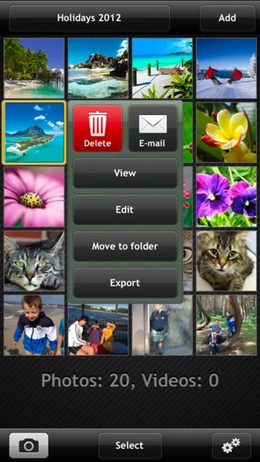 * “Select” mode - when you switch to select mode you can quickly select many images, and then delete them, change folder, send by e-mail, share on Facebook/Twitter/Picasa/YouTube/Dropbox/Flickr, export to 'Photos' and copy to clipboard