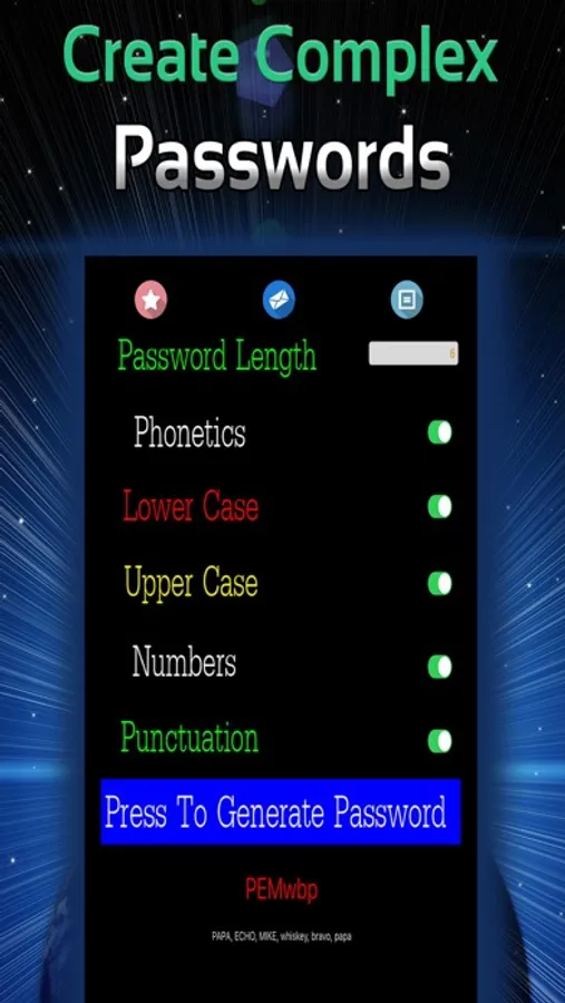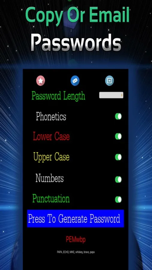 From 2 to 34** characters long, Passwords also allows you to email yourself the password** directly from within the application!
