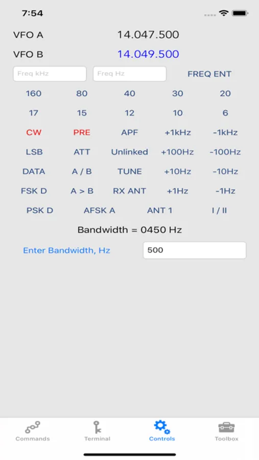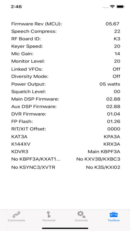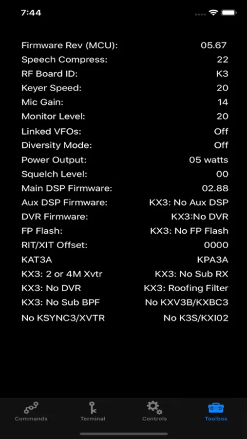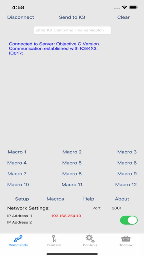 K3iNetwork has windows patterned after the Command Tester and Terminal windows of the Elecraft K3 Utility program. It provides similar functionality, and it can all be accomplished remotely using the iPhone. Once the user establishes communication with the K3, K3S, KX3 or KX2 via a WiFi network the iPhone is used to control the radio.