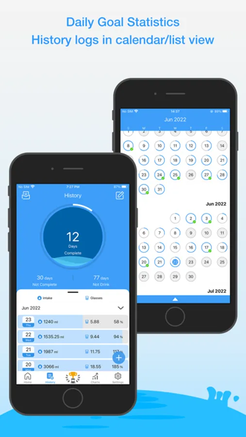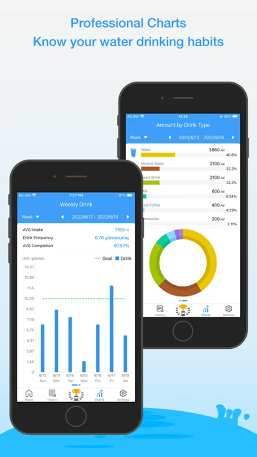 ⁃ Histogram to show the amount of your one day’s, recent one week’s and one month’s amount of drinking water.