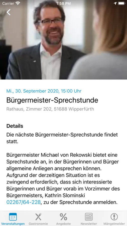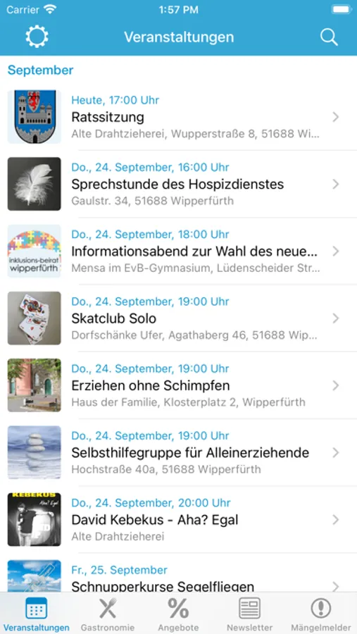 Die neue Oberfläche erstrahlt nicht nur in den Farben der Stadt, sondern bietet zu den wichtigsten Informationen die richtigen Funktionen an. Erhalten Sie einen Überblick über bevorstehende Veranstaltungen und fügen Sie diese Ihrem Kalender hinzu. Lassen Sie sich den Standort eines Wipperfürther Restaurants auf der Karte anzeigen oder sehen Sie, wann das nächste Sonderangebot verfügbar ist.