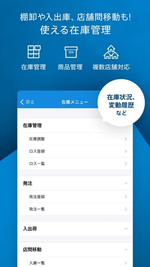 入荷、出荷、店舗間移動、在庫変動履歴、棚卸など、本格的な在庫管理機能をご用意。