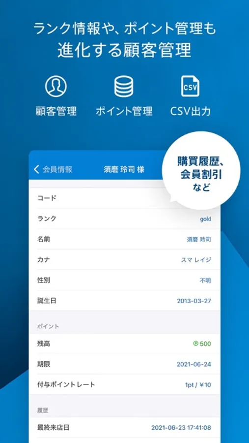 会員情報(名前・生年月日・購買履歴など)を端末で確認できます。